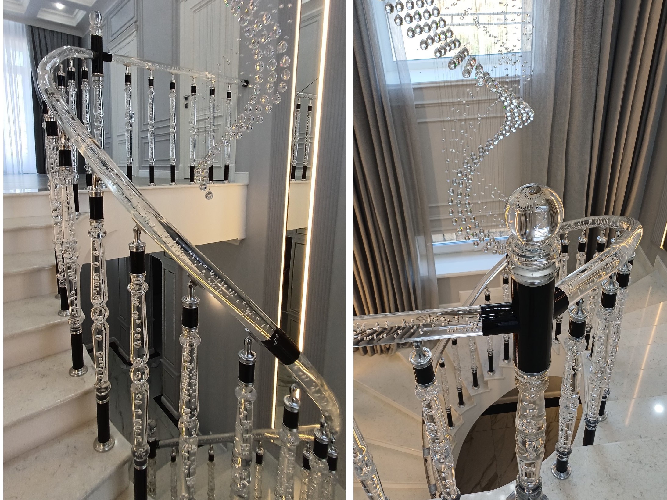 Поручни из акрила могут царапаться, затираться (спустя годы), поэтому при планеровке ограждения расчитывайте аккуратнее , где будет акрил, а где стеклянные поручни, так как они одинаковы