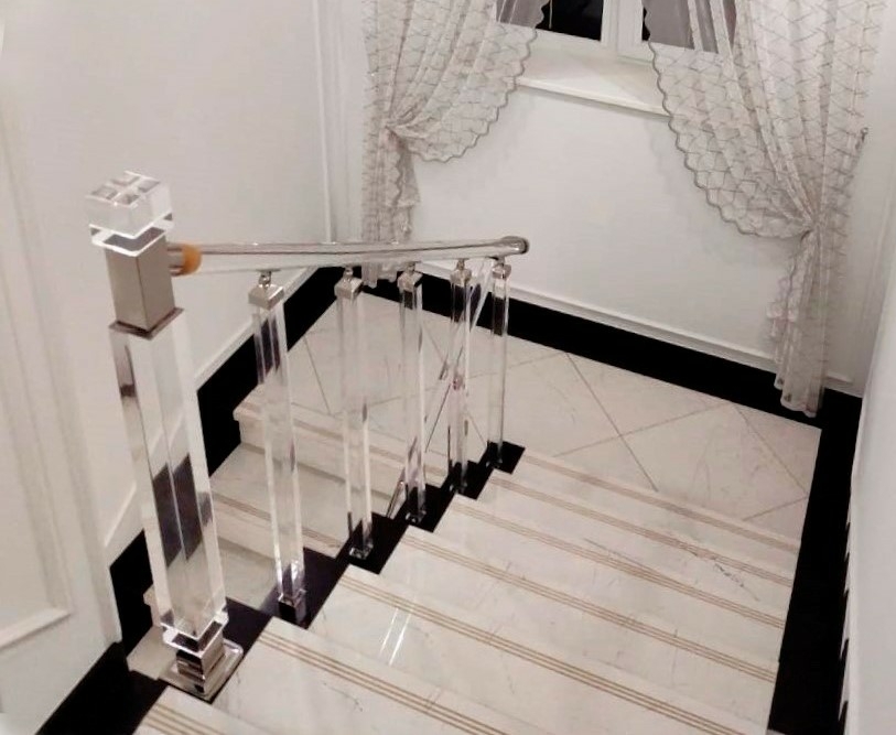 Поручни из акрила могут царапаться, затираться (спустя годы), поэтому при планеровке ограждения расчитывайте аккуратнее , где будет акрил, а где стеклянные поручни, так как они одинаковы