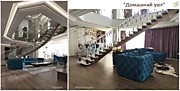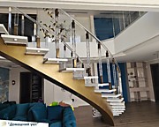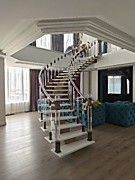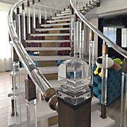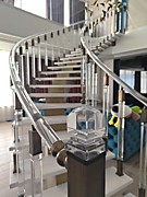 Как видно из визуализации проекта, изначально планировалось листовое стекло, но так как листовое стекло изгибать по радиусу в 3D и изготавливать деревянный радиальный поручень- это нереально долго, сложно возиться с шаблонами и поэтому дорого (мы ранее с этого начинали изготовление ограждений, поэтому знаем весь процесс), то было клиентом принято решение установка на самой лестнице акриловые ограждения, а по периметру второго этажа уже прямое листовое стекло.